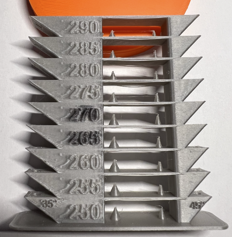 The temperature tower showed me a good temperature would be betwee 265°C and 270°C. I opted for the 265°C, as I would be printing PLA concurrently, and I did want to keep that temperature difference as low as possible.