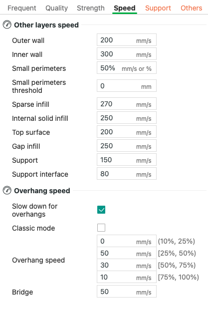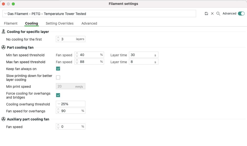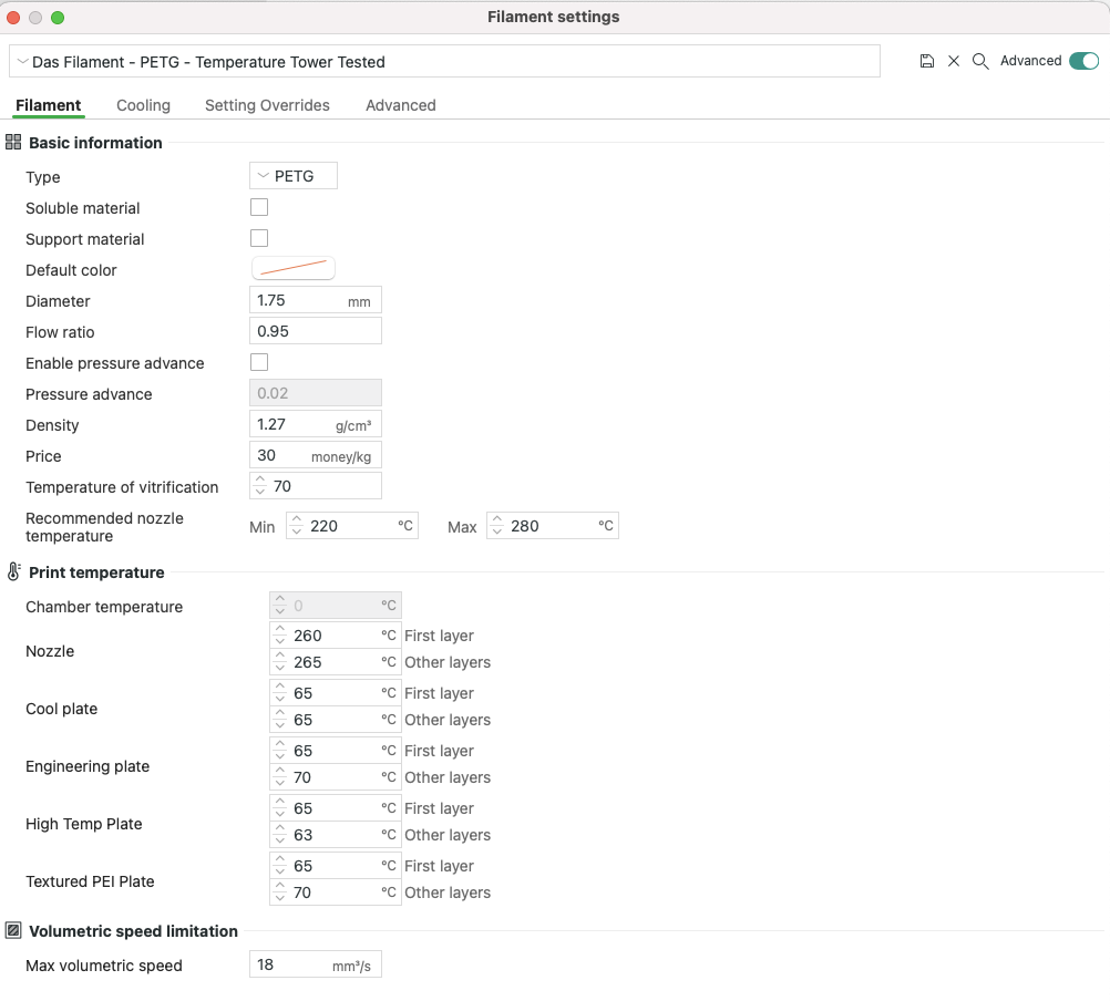 The filament settings for the temperature tower inspired me to use similar settings for the actual print.