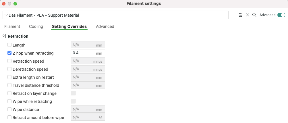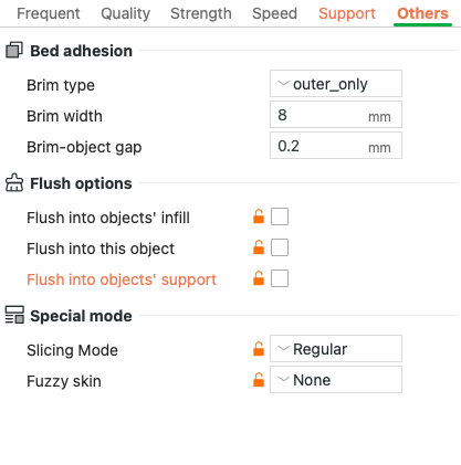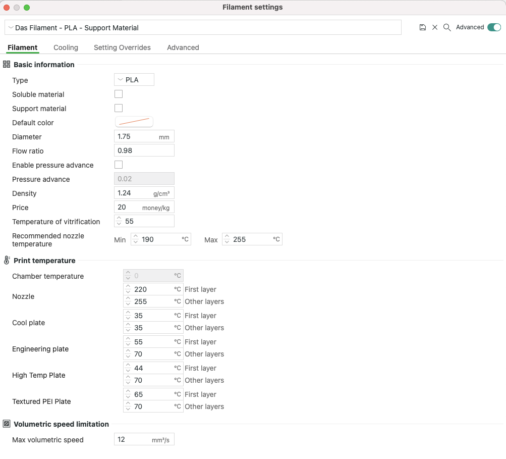 For the support material, I pushed it up in terms of temperature as I had suspected the temperature differences being responsible for the brittleness of the final product. Here are the settings: