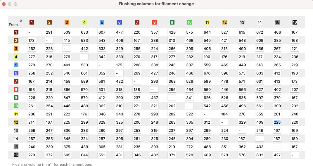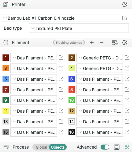 As I have 4 AMS, I've some material to choose from; I print mostly PET-G, so I'm showing below those settings. As you can see above, I used 15 for main material and 12 for support. It's a good thing to have a slightly off color so that while can keep a low purge volume and still avoid color bleed, you can still see the support material clearly on the printed object.