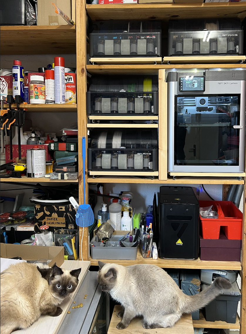 - I've added rolling desks using some cheap rails (that I got at about no cost as spare parts from Ikea), so I can pull out each AMS and also the printer