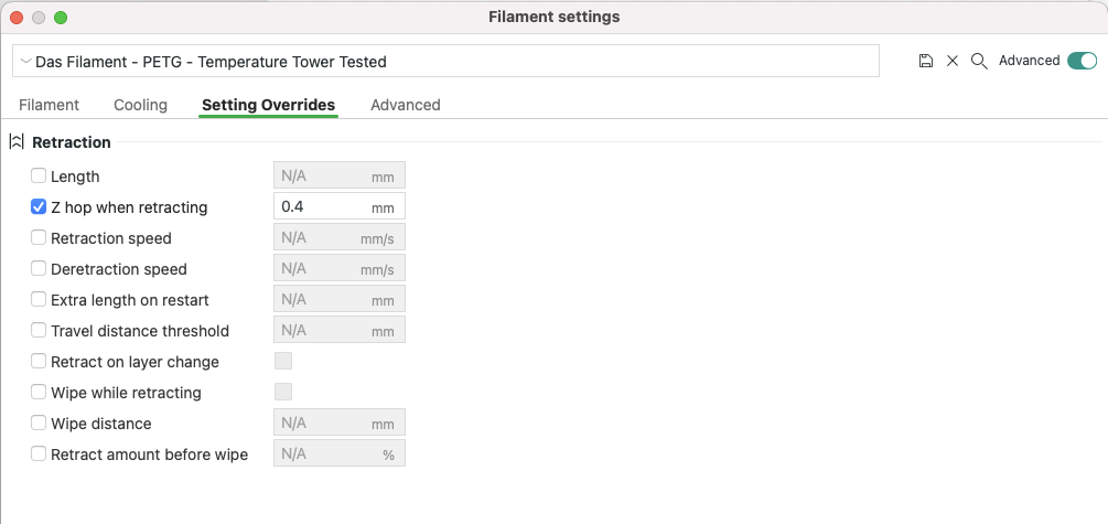 The filament settings for the temperature tower inspired me to use similar settings for the actual print.