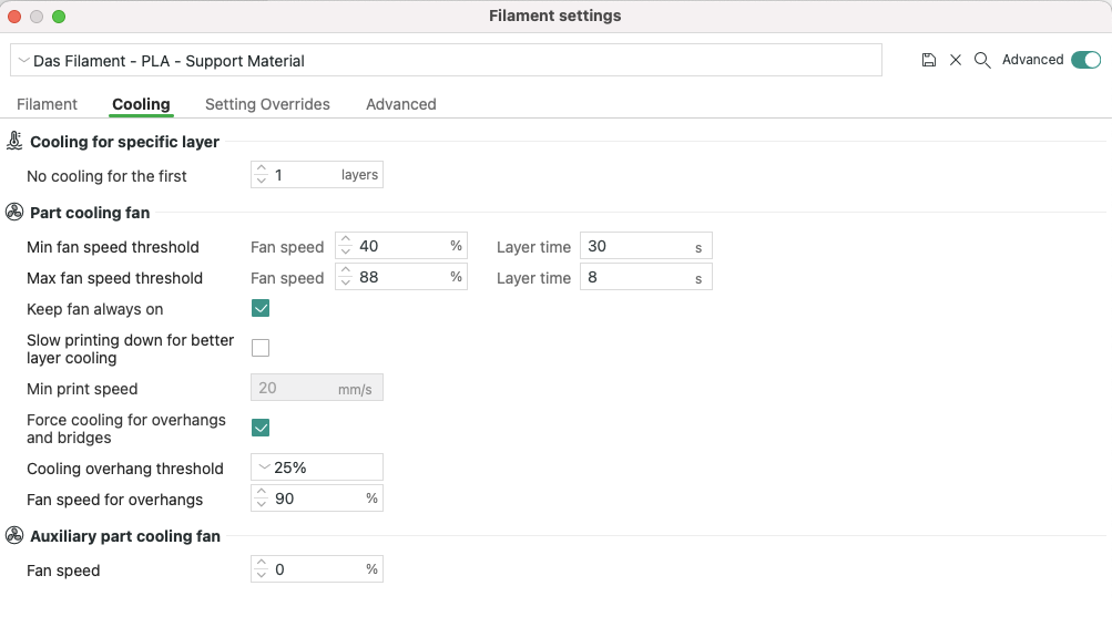 For the support material, I pushed it up in terms of temperature as I had suspected the temperature differences being responsible for the brittleness of the final product. Here are the settings: