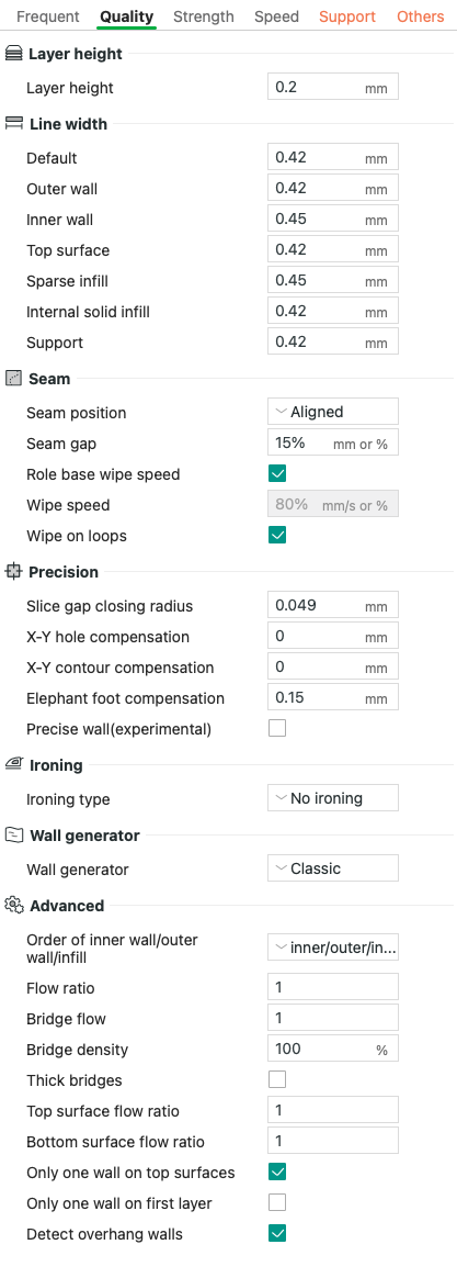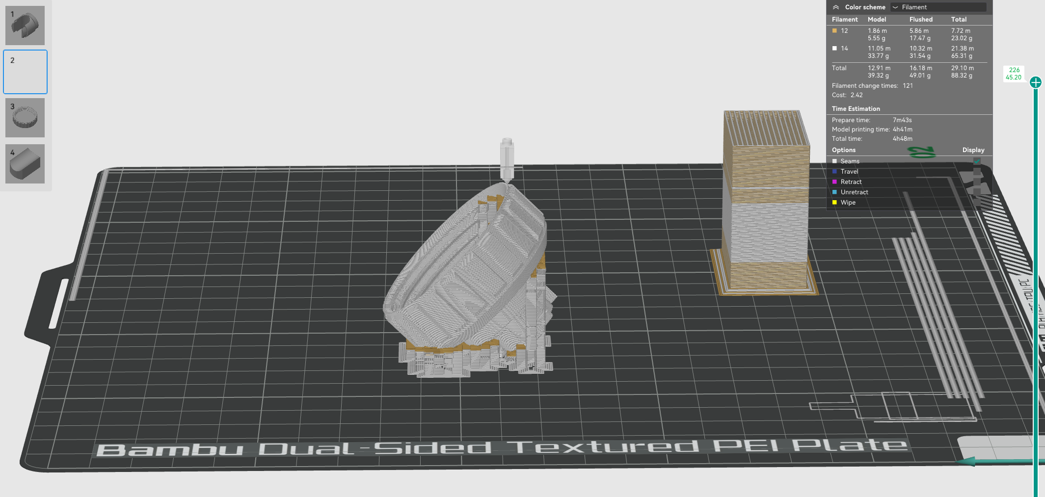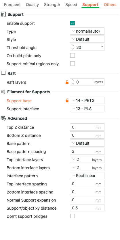 As I have 4 AMS, I've some material to choose from; I print mostly PET-G, so I'm showing below those settings. As you can see above, I used 15 for main material and 12 for support. It's a good thing to have a slightly off color so that while can keep a low purge volume and still avoid color bleed, you can still see the support material clearly on the printed object.