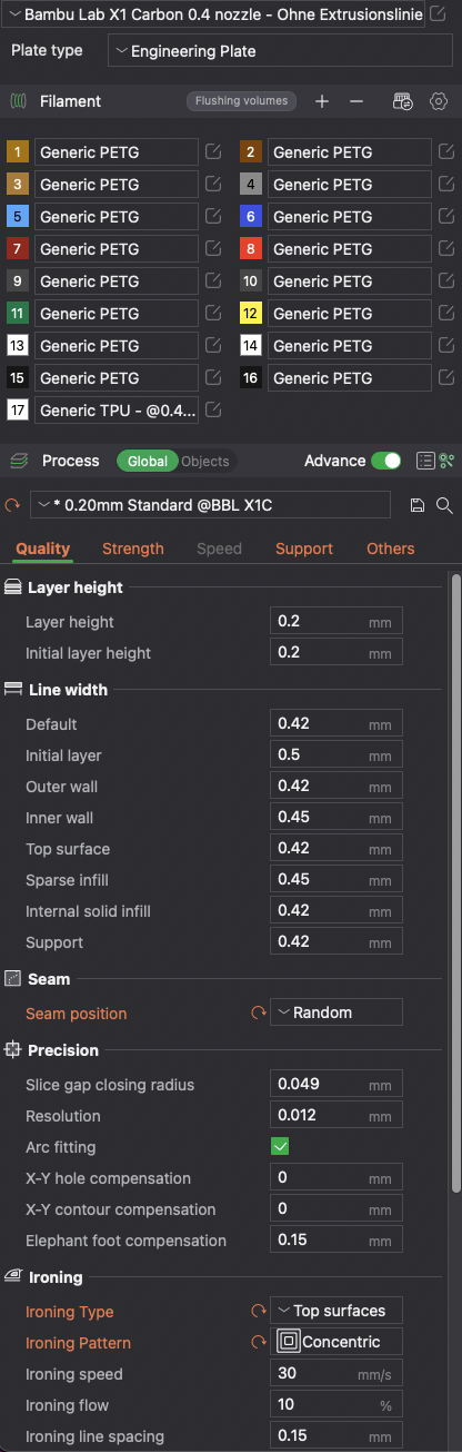 I changed about nothing in the "Quality" section; I was printing a vacuum seal, so I set the seam position to random; I wanted a clean surface, so I enabled ironing.