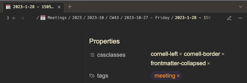So the solution to that is of course to not do this all of the time, but to have the frontmatter-collapsed there optionally, and use it where needed, typically via a Templater plugin. For the rare cases where I don't want to see any frontmatter (Dashboards), I use the frontmatter-hidden class, and particularly for Memex, where I have no control over the yaml that Memex writes, I will go with the default Obsidian behavior:
