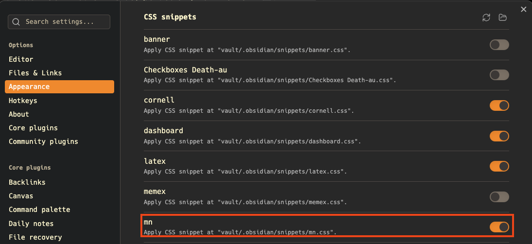Create some file mn.css with the above content, and put it into the .obsidian/snippets folder of your vault. Then, activate it in your settings: